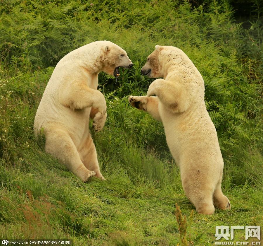 2015年7月23日消息(具体拍摄时间不详),英国苏格兰高地Kingussie野生动物公园,两只北极熊互相打闹,两只后腿站立在草地上拥抱、摔跤,它们咆哮着看似在打架 ,实际是在调整对方在野外生存必须需要的战斗和狩猎技巧。