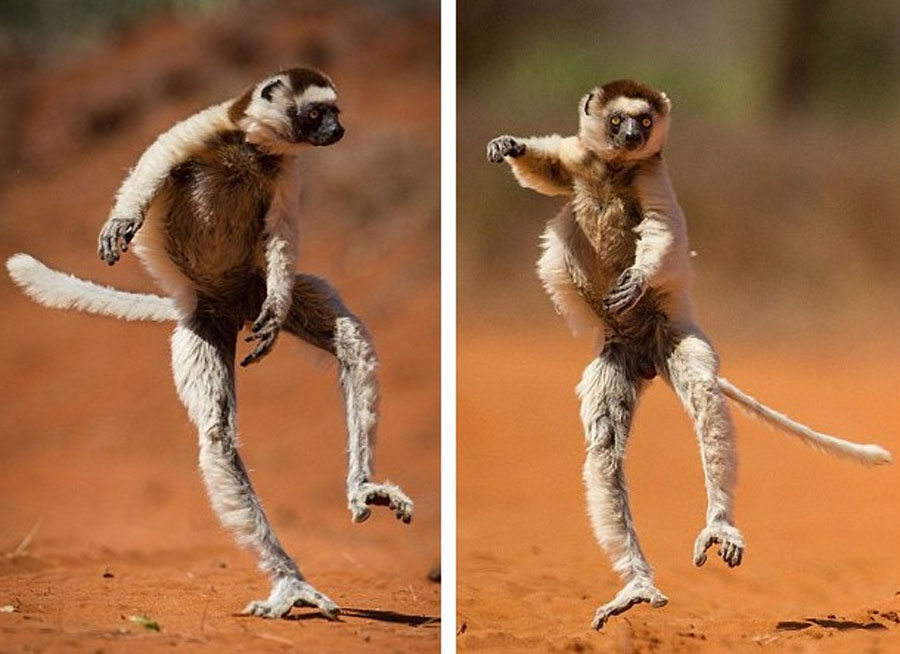 在这组画面中,一群狐猴吃完浆果后从果树上跳下来,准备穿越一条小土路后爬到不远处的另外几棵果树上。这群狐猴一跳到地面上,就开始了它们独特的舞蹈动作:或跳跃、或旋转、或伸展,模样滑稽。一路上,狐猴们一秒都没有停下来,其中一些甚至还表演了高难度的杂耍动作。