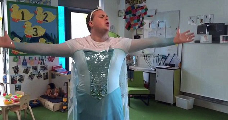 国际在线专稿:据英国《每日邮报》7月22日报道,英国大曼彻斯特小学老师克里斯·海尔(Chris Hill)为了向自己的毕业班同学告别,亲自反串《冰雪奇缘》中的女主角艾莎(Elsa),通过改编歌词演绎了该剧的著名主题曲《随它吧》(Let It Go),虽然频频跑调,但海尔老师这种“不畏”镜头诙谐幽默的卖力演出还是赢得了学生们的一片赞扬之声。