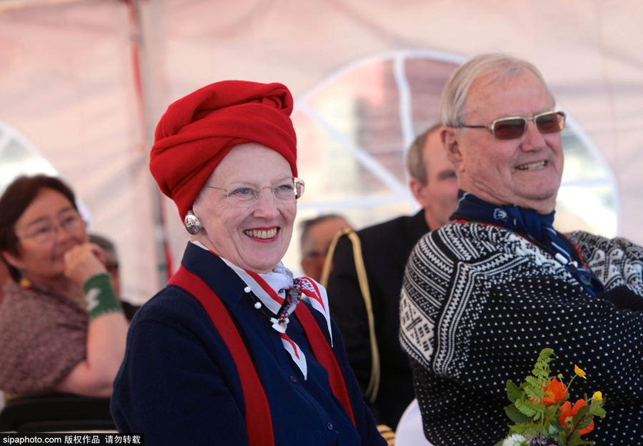 当地时间2015年7月22日,格陵兰岛,丹麦女王玛格丽特二世与亨利克亲王参观、访问格陵兰岛,着因纽特传统鲜艳礼服精神矍铄,受到当地群众的欢迎。