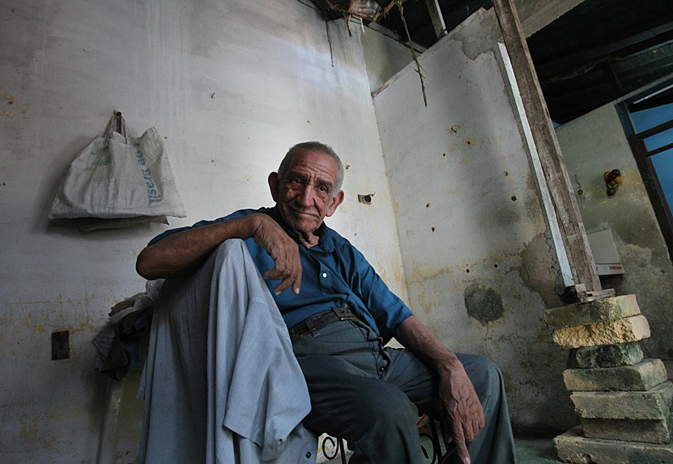 77岁的拉乌尔·扎帕塔·巴霍住在马坦萨斯省,他的厨房屋顶已经部分坍塌,只能用砖头和临时柱子支撑。(网页截图)