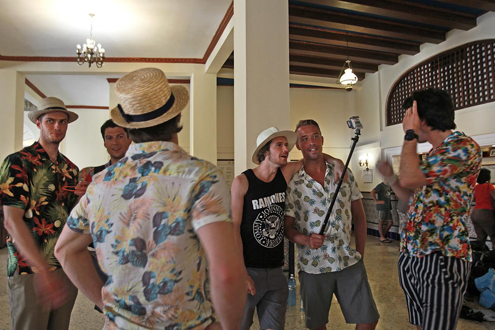 在塞维利亚酒店大厅中,这群来自荷兰的年轻人正在自拍,他们身上穿着夏威夷式花衬衫。(网页截图)