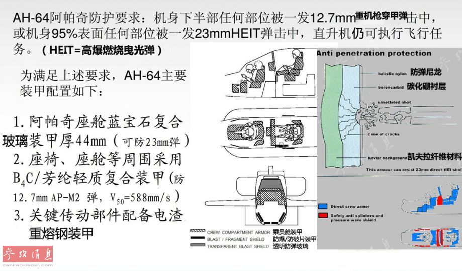 为应对敌方的低空防空火力,”阿帕奇“机身采用了完备的装甲防护系统(全机身装甲重1.1吨)以及自密封油箱(被命中后不会漏油),乘员舱和旋翼都可抵挡一发23毫米高爆弹直接命中。即使坠毁时,起落架也能吸收大部分能量,保护驾驶员。图为AH-64装甲防护示意图,最右小图为“阿帕奇”三重装甲防弹保护层原理示意图。