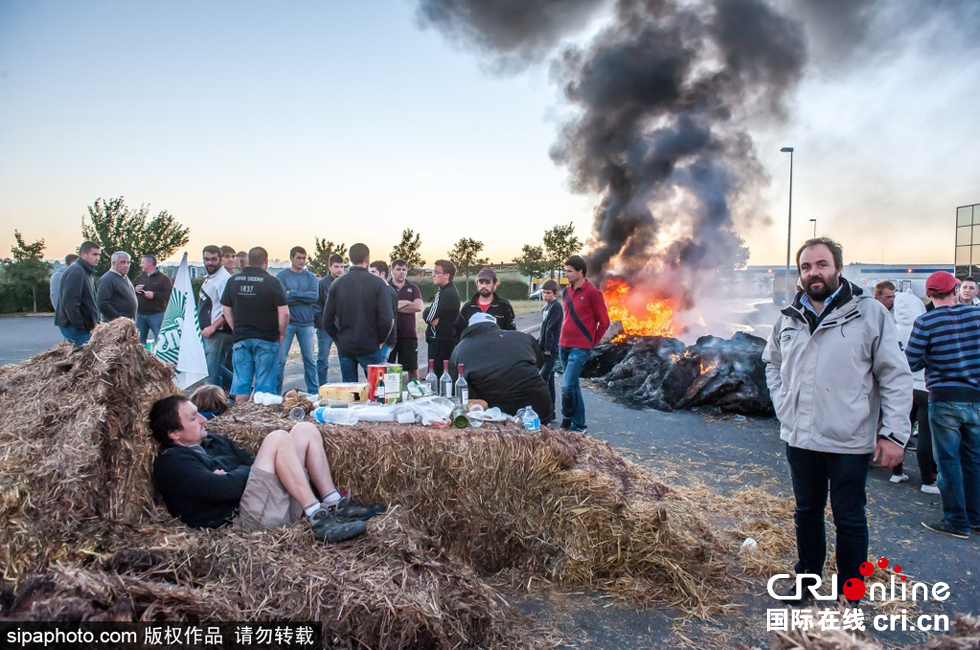 当地时间2015年7月23日,法国西南部小镇吕费克(Ruffec),当地法国畜牧业生产者以及牛奶制造商继续举行示威游行,不仅设置路障堵住道路还用焚烧轮胎等方式连日大规模激烈抗议肉类等价格过低问题,农民抗议形势愈演愈烈。