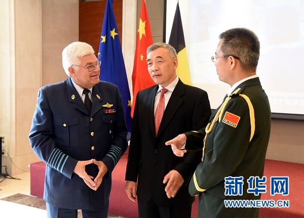 7月23日,中国驻比利时大使曲星(中)、比利时国防参谋长范卡伦贝格(Gerard Van Caelenberge)(左)与中国驻比利时王国陆、海、空三军武官郜彤在招待会上友好交谈。新华社记者姜岩摄