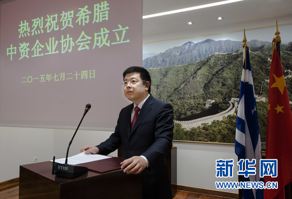 希腊中资企业协会7月24日在雅典成立,中国驻希腊大使邹肖力和十多家希腊中资企业负责人出席成立大会。图为中国驻希腊大使邹肖力在成立大会上致辞。新华社记者刘咏秋摄