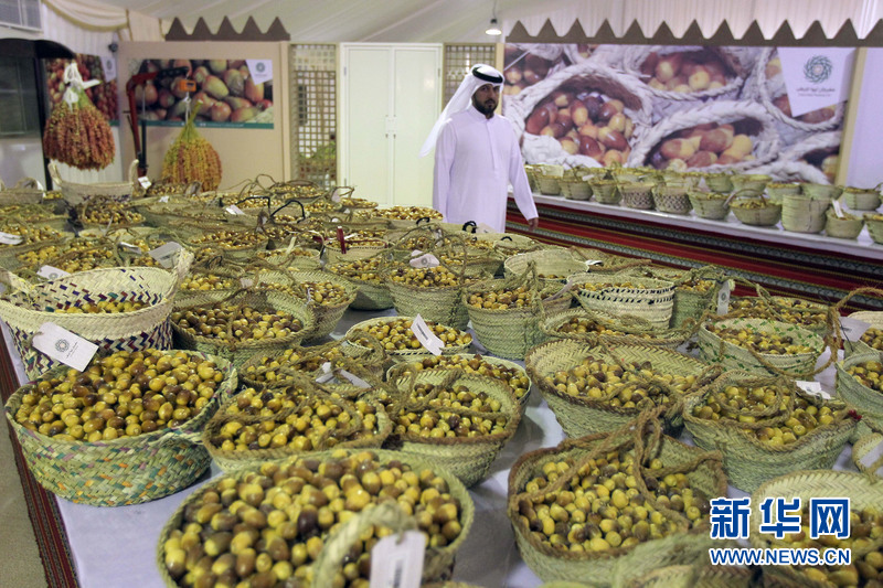 一位阿联酋男子从送选参评的椰枣前走过。新华社发(椰枣节组委会供图)