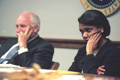 图片说明:上图:“9·11”恐怖袭击发生后,时任副总统切尼(左)和国家安全事务助理赖斯坐在“白宫地堡”的会议桌前,脸上“写满”了紧张和恐惧。