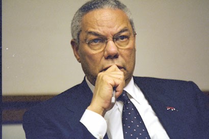 图片说明:左图:时任国务卿鲍威尔在“白宫地堡”参加会议,嘴里咬着一支笔,紧张情绪溢于言表。 均东方IC