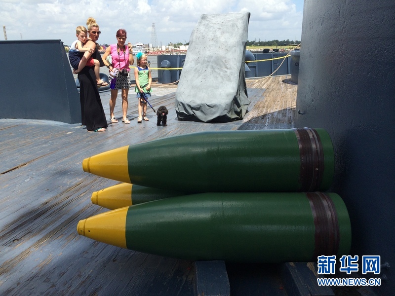 一家游人在看舰上的巨型炮弹。新华网记者 张永兴摄