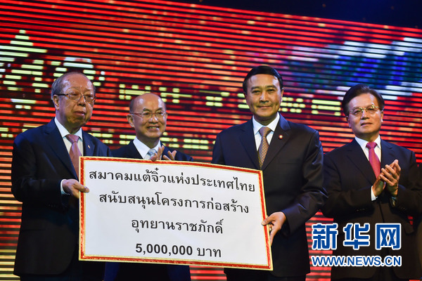 7月26日晚,泰国潮州会馆主席蔡汉强、泰国枢密院大臣甲盛瓦塔纳猜、泰国陆军司令乌敦德、中国驻泰国大使宁赋魁(由左至右)出席中泰建交40周年庆祝活动。蔡汉强代表潮州会馆捐资500万泰铢建设拉差帕国家公园。 新华网记者 李芒茫 摄