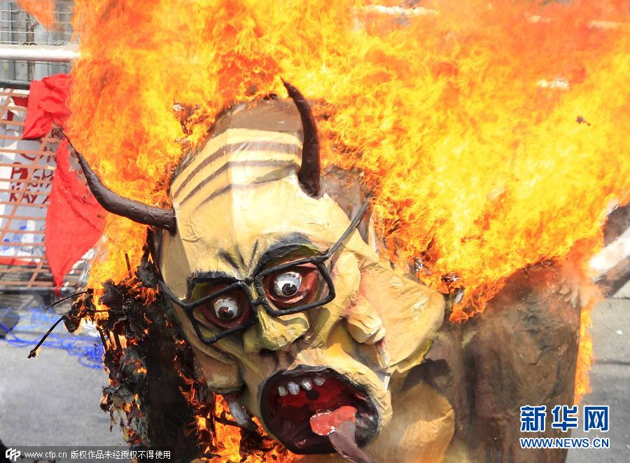 当地时间2015年7月27日,菲律宾奎松,示威者焚烧总统阿基诺三世的肖像,举行抗议示威。阿基诺三世将于27日发表其任期内最后一次国情咨文演讲。 CFP