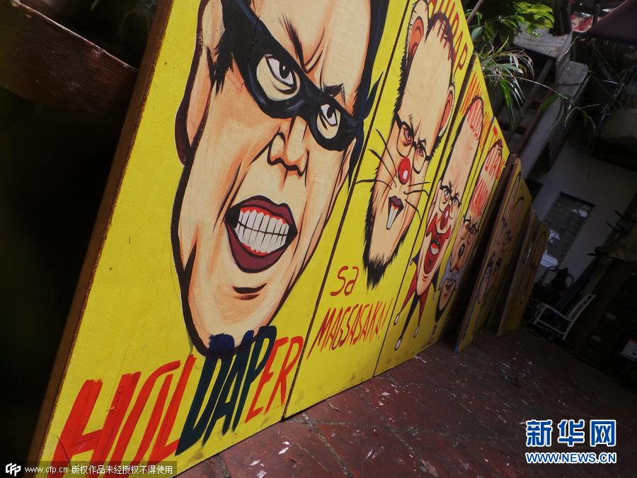 当地时间2015年7月26日,菲律宾奎松,示威者制作恶搞总统阿基诺三世的标语牌。阿基诺三世将于27日发表其任期内最后一次国情咨文演讲。CFP