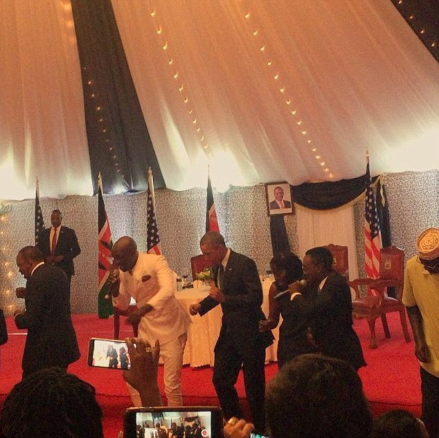 当地时间25日晚,肯尼亚总统乌呼鲁肯雅塔(Uhuru Kenyatta)设国宴欢迎奥巴马。奥巴马在国宴上与非洲嘻哈乐队Sauti Sol大秀了一段当地最近很火的舞蹈。
