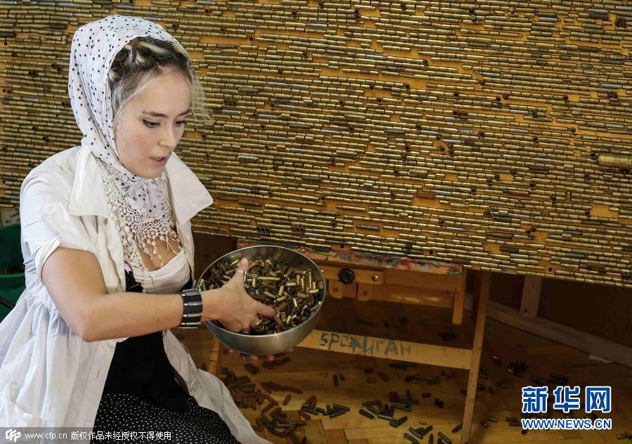 当地时间2015年7月22日-23日,乌克兰基辅,乌克兰艺术家Dasha Marchenko使用在乌克兰东部前线收集回来的约5000枚不同种类、不同口径大小的弹药壳在自己的工作室内创作出了巨幅普京肖像。
