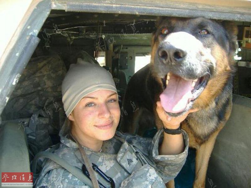 和美军女兵一同乘坐装甲车的军犬。