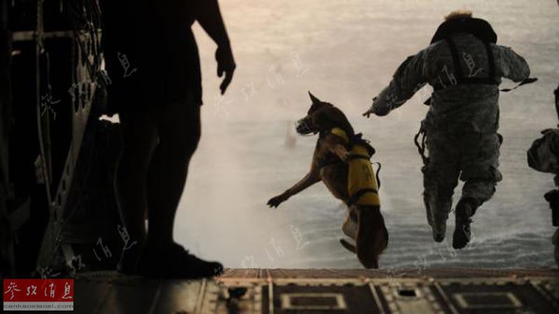 图为随美军特战队一同跳入水中的工作犬。