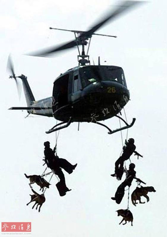 图为随美军特战队一同使用SPIE(紧急撤离吊带)演练紧急撤离的军用工作犬。1