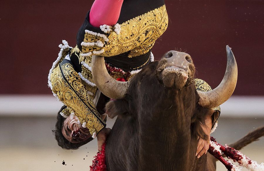 当时,身穿金色华服的斗牛士洛伦佐准备用剑刺向已经受伤的公牛,完成最后一击。但出其所料,愤怒的公牛似乎要和他一决生死,狠狠直冲过去将其撞飞。随后,被抛到空中的洛伦佐犹如一个破布娃娃,任公牛排布,胸部和腿部都被尖利的牛角刺伤,甚至在空中的一瞬间都可见到他受伤左腿上的鲜血顺着脸颊滴滴流下的血腥画面。而气疯了的公牛显然还不解气,它用犄角直戳进洛伦佐的胸部。躺在地上的洛伦佐发出痛苦的哀嚎,奋力掰住牛头和它殊死对抗。