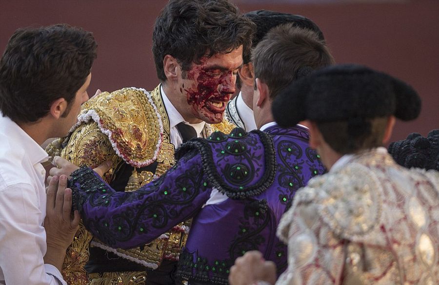 西班牙斗牛士剑刺公牛反被顶受伤(高清组图)