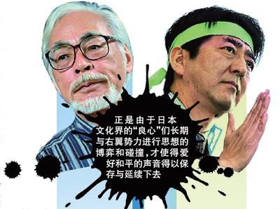 在日本文化界,一方面是像宫崎骏、山田火砂子这样渴望和平、有担当的“良心”,另一方面也有与安倍政权遥相呼应的“文化右翼”。