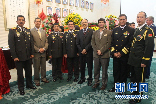 中厄来宾合影(左一联指参谋长弗莱伊莱中将、左三陆军司令奥万多中将、左四联指司令加尔松司令、右一我驻厄国防武官赵军、右二海军司令圣地亚哥中将、右三国防部副部长森佩尔特基、右四我驻厄特命全权大使王士雄)。新华社记者 梁君茜 摄