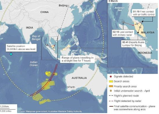 2014年3月8日,载有239人的马来西亚航空由吉隆坡前往北京的MH370号班机起飞不到一小时失踪,根据数据分析,最终认为航机进入并坠毁于南印度洋,但多国搜救团队均未有发现。