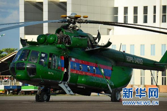 这是2012年12月23日在老挝首都万象拍摄的此次坠毁的编号为RDPL-34062的军用直升机。老挝国防部29日发布公告称,老挝一架军用直升机27日下午从首都万象飞往北部省份华潘的途中坠毁,机上人员共23人。这架直升机为俄制米-17型,载有4名机组人员及19名乘客。 新华社发(刘艾伦摄)