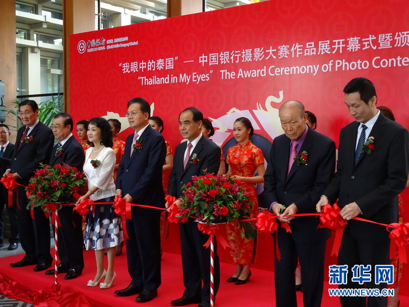 7月25日,为纪念中泰建交40周年,中国银行(泰国)股份有限公司在曼谷中国文化中心举办“我眼中的泰国”摄影大赛作品展览暨颁奖典礼。图为出席典礼的中国驻泰大使宁赋魁阁下(左四)、中银泰国张雷行长(左五)和曼谷中国文化中心蓝素红主任(左三)。新华网记者 李颖 摄