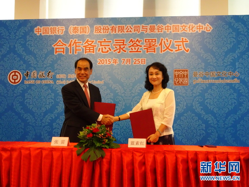 中国银行秉承“担当社会责任、做最好的银行”的战略,积极促进中泰文化交往。图为7月25日,中银泰国与曼谷中国文化中心签署合作备忘录,双方将在推广中华传统文化等方面开展全面合作。新华网记者 李颖 摄