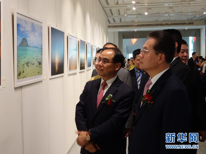 7月25日,中国驻泰大使宁赋魁(右一)和中银泰国张雷行长在参观”我眼中的泰国“摄影大赛作品。新华网记者 李颖 摄