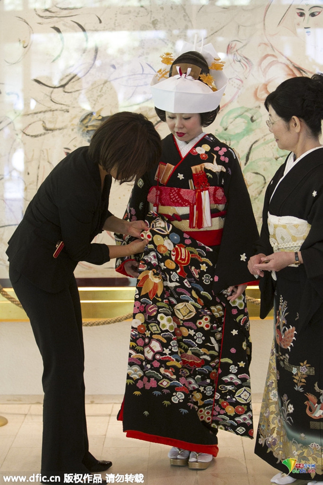 实拍日本传统婚礼 新郎新娘穿和服神社宣誓永不分离【组图】