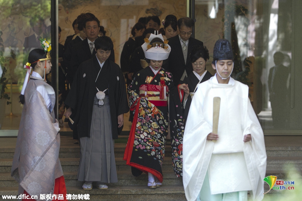 实拍日本传统婚礼 新郎新娘穿和服神社宣誓永不分离【组图】