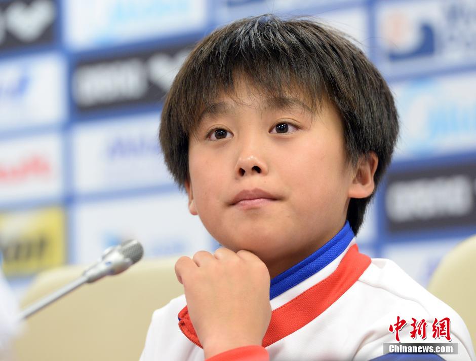 当地时间7月30日晚间,第16届国际泳联世锦赛跳水女子十米台决赛在俄罗斯喀山市举行,朝鲜小将金云香以397.05分夺得冠军。图为金云香在赛后发布会上。中新社发 侯宇 摄