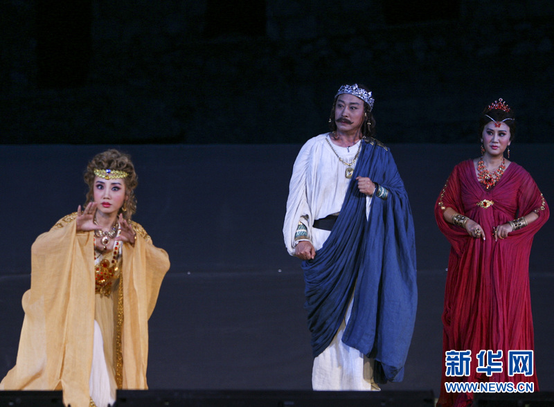 29日在中国大型评剧《城邦恩仇》演出剧照。具有预言能力、被阿伽王俘回的特洛伊公主卡桑(左)看破王宫杀机,但立即被王后科绿黛(左)与埃珪斯(中)禁声。由中国评剧院推出、著名导演罗锦鳞执导的大型评剧《城邦恩仇》29日晚在希腊埃莱夫西纳市埃斯库罗斯戏剧节上与数百名中希观众见面。该剧根据古希腊悲剧之父埃斯库罗斯《俄瑞斯忒亚》三联剧改编,以火、血、奠、鸠、审串联成单本戏,将古希腊悲剧的“简洁、庄严、肃穆”风格与中国戏曲的“虚拟、象征、写意”美学原则融合在一起。新华网记者 刘咏秋 摄