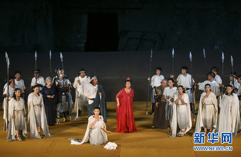29日在中国大型评剧《城邦恩仇》演出剧照。王后科绿黛(中右)与埃珪斯(中左)合谋杀死了阿伽王,侍女(前)呈上阿伽王的血衣。由中国评剧院推出、著名导演罗锦鳞执导的大型评剧《城邦恩仇》29日晚在希腊埃莱夫西纳市埃斯库罗斯戏剧节上与数百名中希观众见面。该剧根据古希腊悲剧之父埃斯库罗斯《俄瑞斯忒亚》三联剧改编,以火、血、奠、鸠、审串联成单本戏,将古希腊悲剧的“简洁、庄严、肃穆”风格与中国戏曲的“虚拟、象征、写意”美学原则融合在一起。新华网记者 刘咏秋 摄