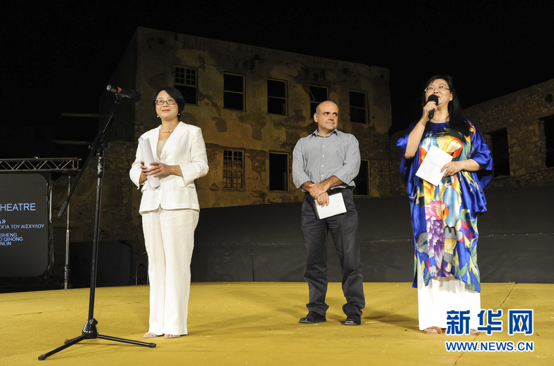 29日在中国大型评剧《城邦恩仇》演出前,中国驻希腊大使夫人宁懿参赞(左)、希腊埃莱夫西纳市市长佐卡拉斯(中,George Tsoukalas)致辞,乾合文化中心创始人、主席罗彤(右)担任翻译。由中国评剧院推出、著名导演罗锦鳞执导的大型评剧《城邦恩仇》29日晚在希腊埃莱夫西纳市埃斯库罗斯戏剧节上与数百名中希观众见面。该剧根据古希腊悲剧之父埃斯库罗斯《俄瑞斯忒亚》三联剧改编,以火、血、奠、鸠、审串联成单本戏,将古希腊悲剧的“简洁、庄严、肃穆”风格与中国戏曲的“虚拟、象征、写意”美学原则融合在一起。新华网记者 刘咏秋 摄