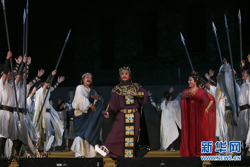 29日在中国大型评剧《城邦恩仇》演出剧照。希腊联军统帅阿伽王(中)历10年特洛亚战争后凯旋回到迈锡尼王宫,受到王后科绿黛(右)与堂弟埃珪斯(左)的热烈拥戴,浑然不觉杀机四伏。由中国评剧院推出、著名导演罗锦鳞执导的大型评剧《城邦恩仇》29日晚在希腊埃莱夫西纳市埃斯库罗斯戏剧节上与数百名中希观众见面。该剧根据古希腊悲剧之父埃斯库罗斯《俄瑞斯忒亚》三联剧改编,以火、血、奠、鸠、审串联成单本戏,将古希腊悲剧的“简洁、庄严、肃穆”风格与中国戏曲的“虚拟、象征、写意”美学原则融合在一起。新华网记者 刘咏秋 摄