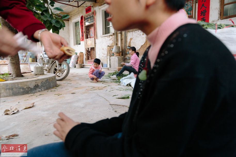 现年23岁的刘禹扬表示,自己是在广东对这个摄影专题产生兴趣的,因为精神病患者和他们的家人往往不是遭到完全无视,就是被人置之不理。“这个群体隐没在了正常的社会里,”刘禹扬周二接受电话访问时说。“在学校或者工作场所,我们既看不到他们,也看不到他们的家人。”图为中国肇庆,一位邻居给欧越益(音)一些零食。她和她的妹妹欧永益(音,左后),以及母亲都患有精神疾病。
