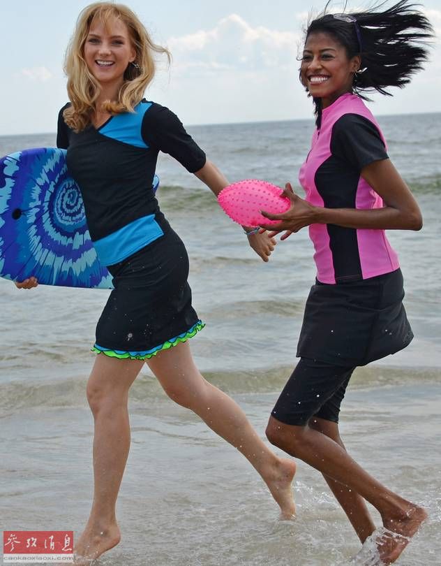 纽约一处海滩上,两名身着HydroChic品牌泳衣的模特。一些服装公司现在着眼于为女性生产“端庄”的泳衣。