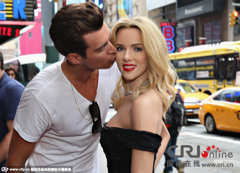 纽约当地时间7月30日,斯嘉丽·约翰逊(Scarlett Johansson)新蜡像曝光。斯嘉丽的蜡像身穿低胸拖地黑裙,造型十分美艳,改造型再现了她出席2014年威尼斯电影节时开幕红毯倩影。现场,男模Luke Stockman忙与女神蜡像搭建合影,还偷吻“揩油”。