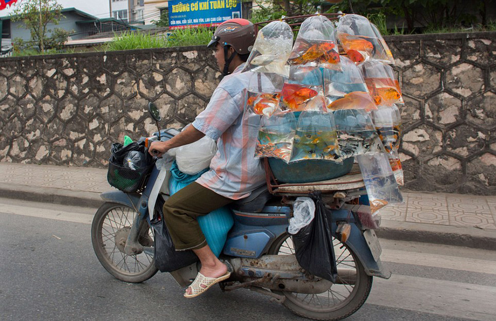 这些摩托车手的货物包括花草树木以及装满各种商品(活鱼、瓶装啤酒、大盒子等)的袋子。这些场景构成了越南人的日常生活,但却令西方游客感到震惊。科恩的照片显示,摩托车手在他们的小车上,几乎可以运送任何你可以想象到的东西。