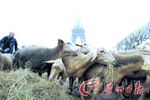 法国农民将牛羊赶上埃菲尔铁塔。