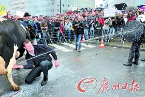 法国农民跑到比利时欧盟总部门口喷射牛奶……