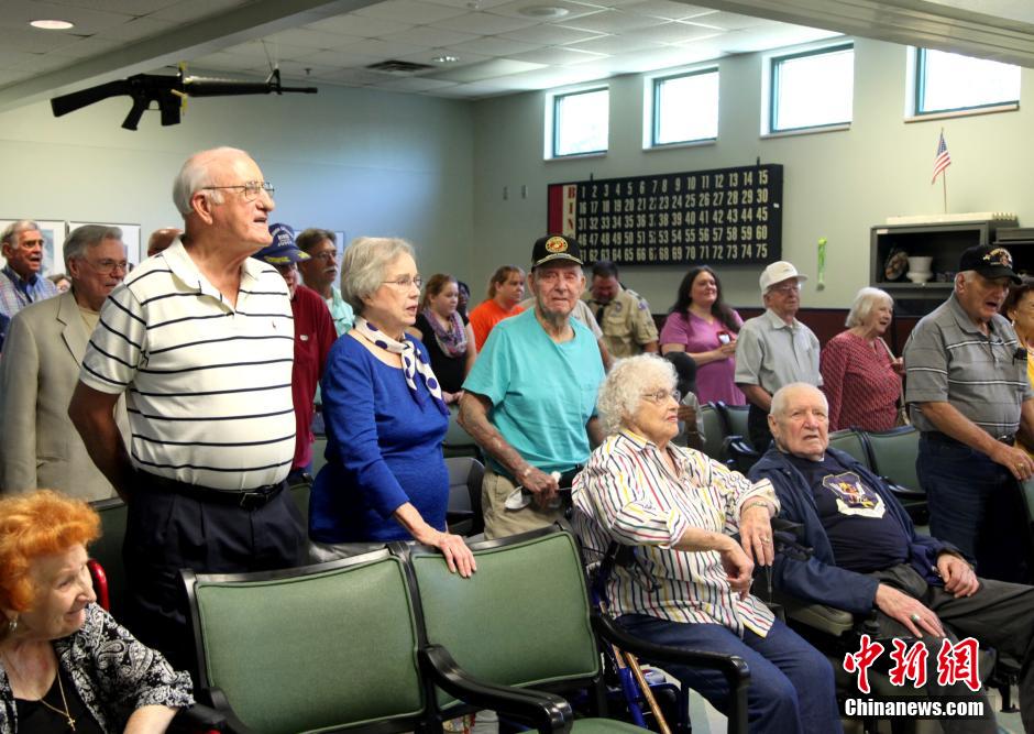当地时间8月1日,美国路易斯安那州门罗市的二战老兵和家人齐聚“老兵之家”,纪念二战结束70周年。该活动由陈纳德航空军事博物馆馆长、陈纳德将军的外孙女凯乐威发起,包括“飞虎队”成员、93岁高龄的理查德·谢尔曼在内的二战老兵和家人出席活动,欣赏“胜利之吻”表演,重温70年前日本宣布无条件投降后庆祝胜利的喜悦。图为老兵和家人共同吟唱怀旧歌曲。 中新社发 王欢 摄