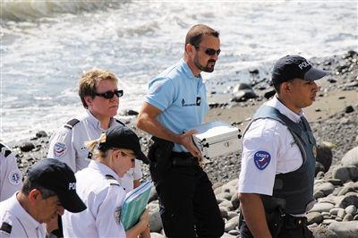 8月2日,法属留尼汪省首府圣但尼,警方人员在发现金属残片的海滩上搜寻调查。当地民众当天发现一块金属残片。新华社发