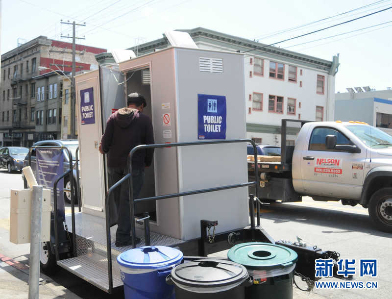 在防堵随地小便的同时,旧金山市政府在一些人口稠密社区街头设立公共厕所,为人们提供方便。图为第16街地铁站口广场“防尿墙”附近的一个流动公厕。