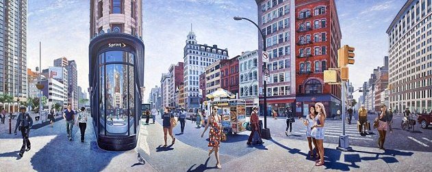 然而要想画出逼真的效果,光靠想象是不行的。沃尔什在动笔画到画布上之前,至少要到当地拍摄100多张照片或者打百来张草稿。图为他画的纽约熨斗大厦。