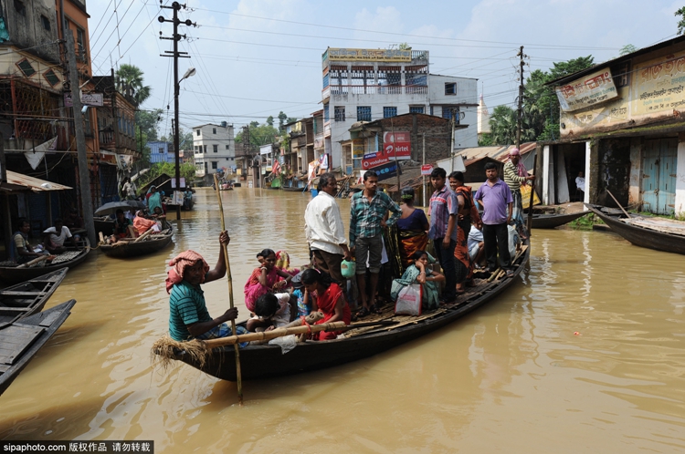当地时间2015年8月2日,印度加尔各答,印度近日来洪水泛滥,当地街道被水淹没,民众划船出行。