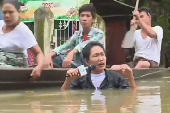 缅甸记者被洪水没过脖子坚持播报灾情(图)